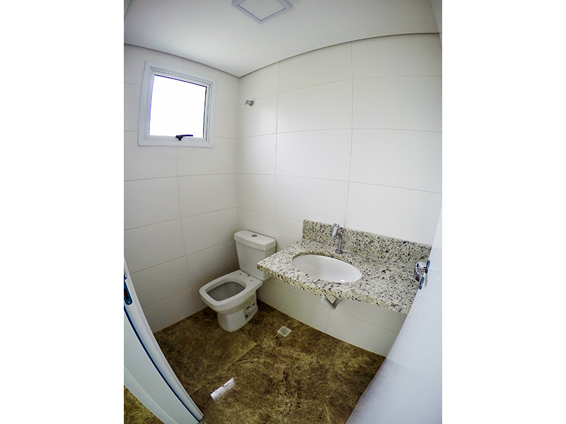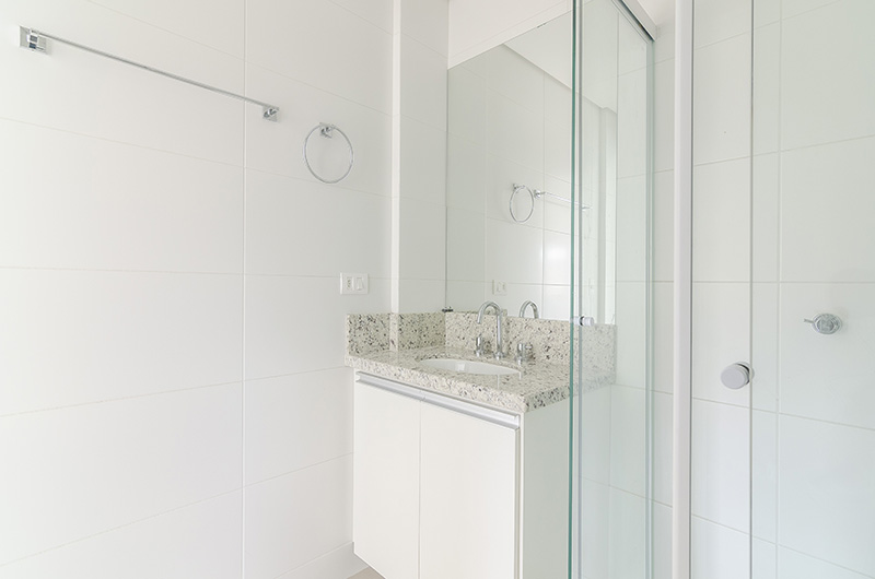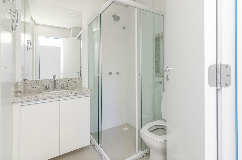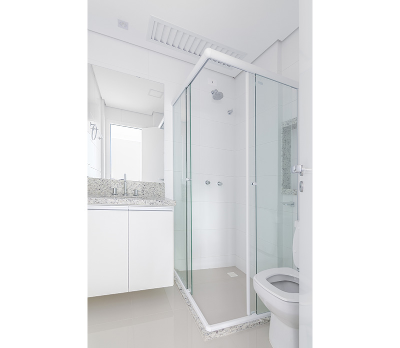 ** Banheiro com armário sob a pia, box blindex, pia em granito, torneira duplo comando, ducha higiênica e chuveiro com aquecimento á gás.