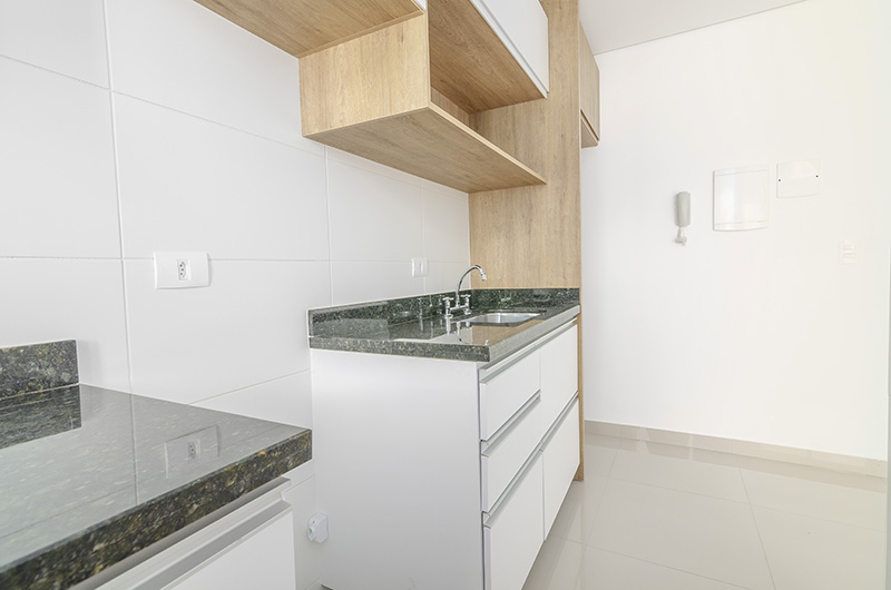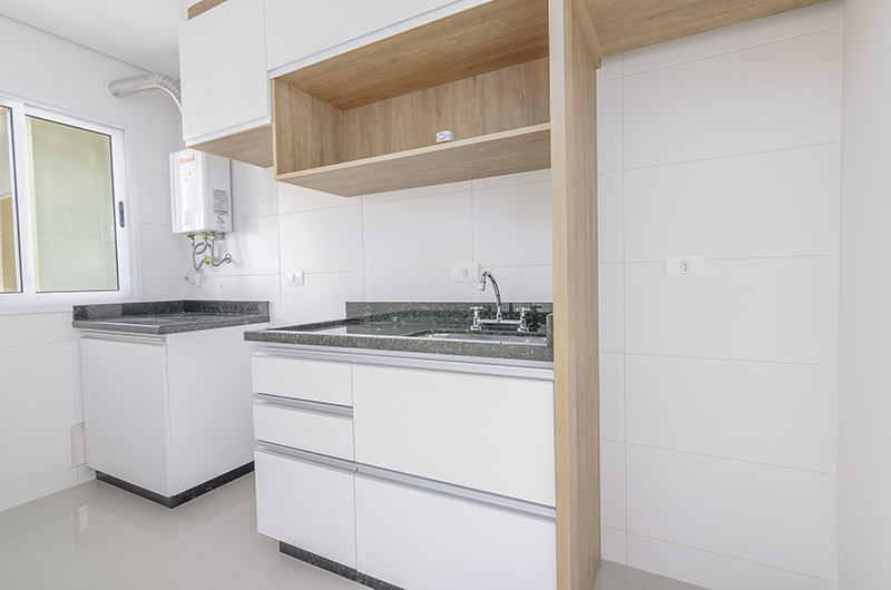 ** Cozinha se integra a sala e conta com móveis planejados e pia em granito.