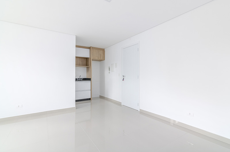 ** Apartamento com piso em porcelanato polido na sala e cozinha, e piso vinílico nos quartos.