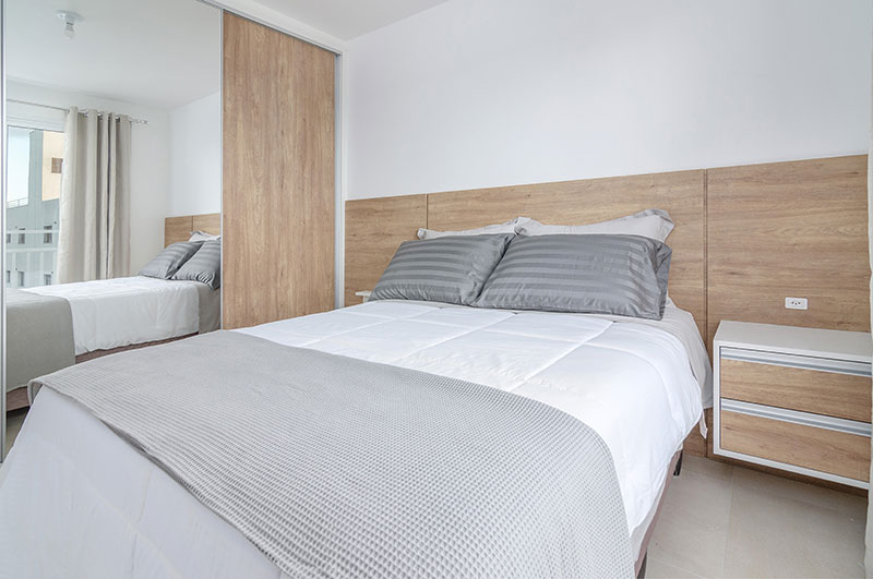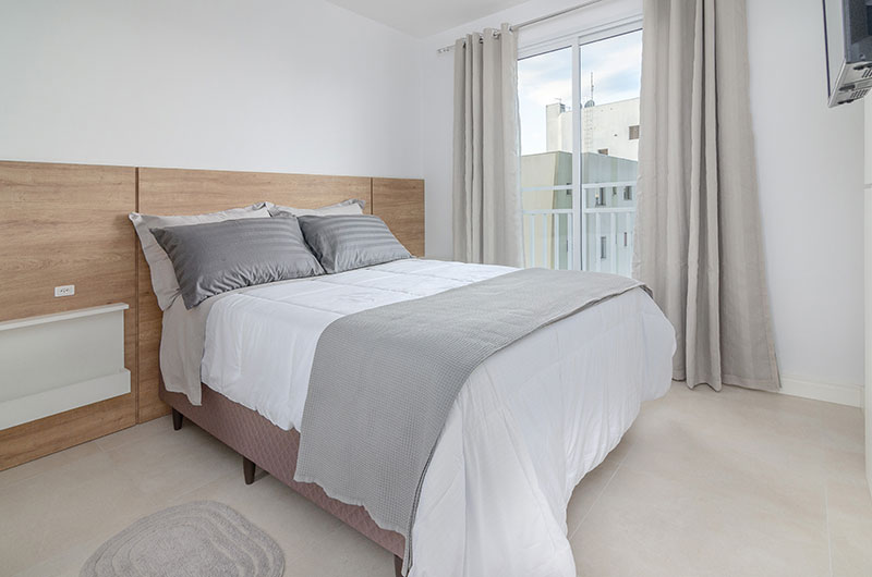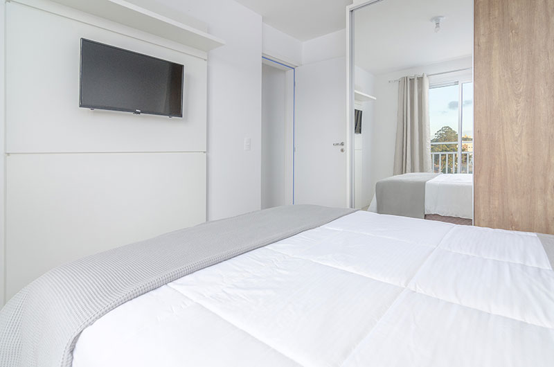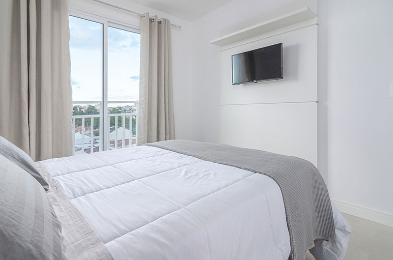 * Quarto com armário planejado, cama box com colchão de molejo, painel para tv, tv de LED de 28 polegadas e cortinas blackout.
