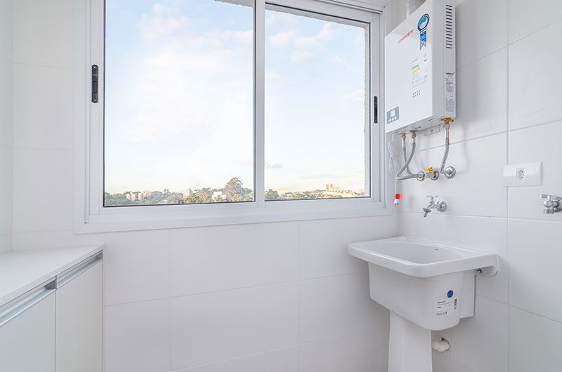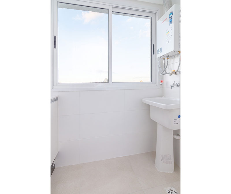 * Área de serviço bem ventilada com móveis planejados, tanque em cerâmica e máquina de lavar.