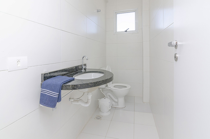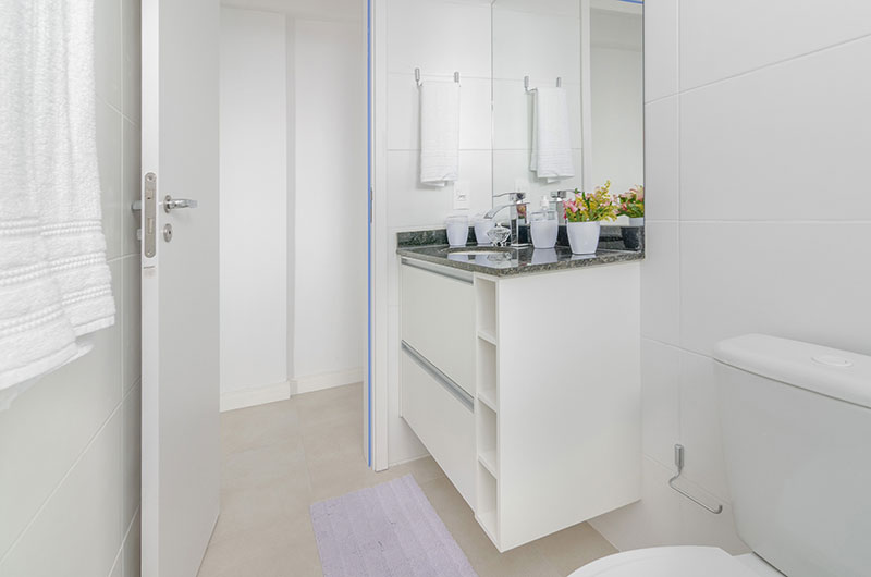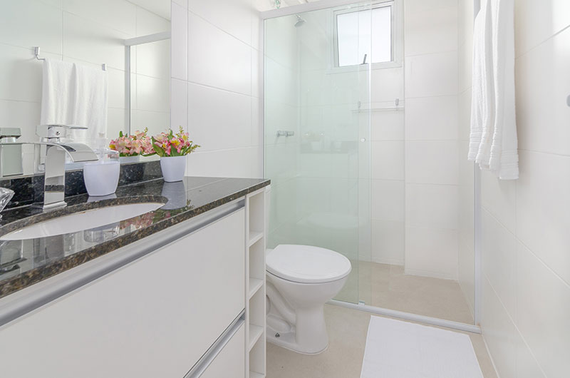 * Banheiro com armário, bancada em granito, box em vidro temperado, espelho e ducha á gás.