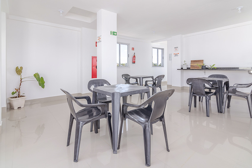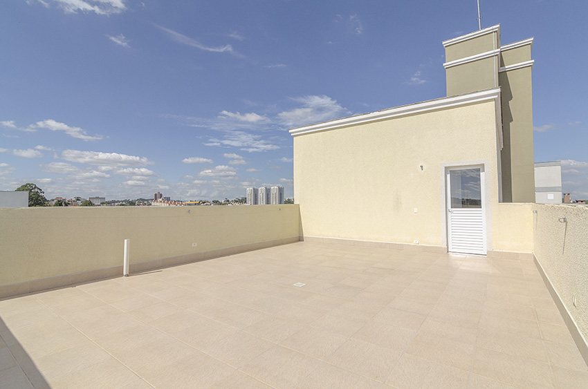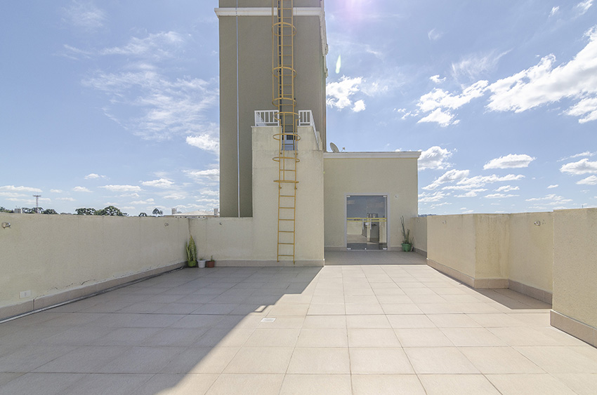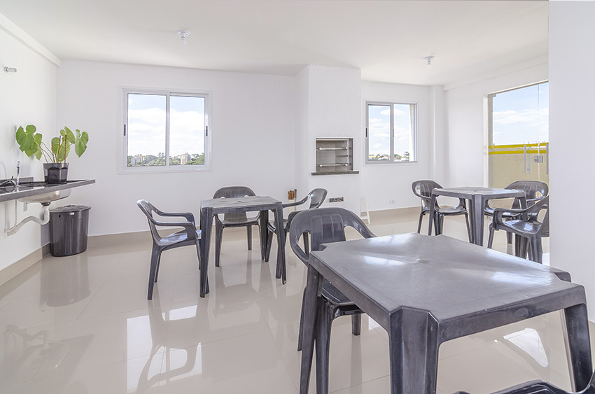 ** Condomínio com salão de festas com churrasqueira na cobertura e terraço com solarium.
