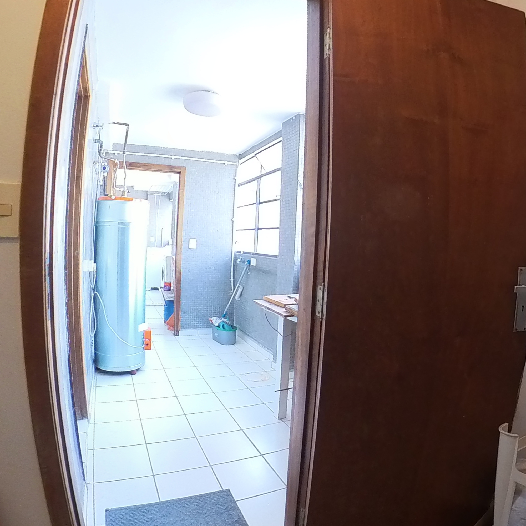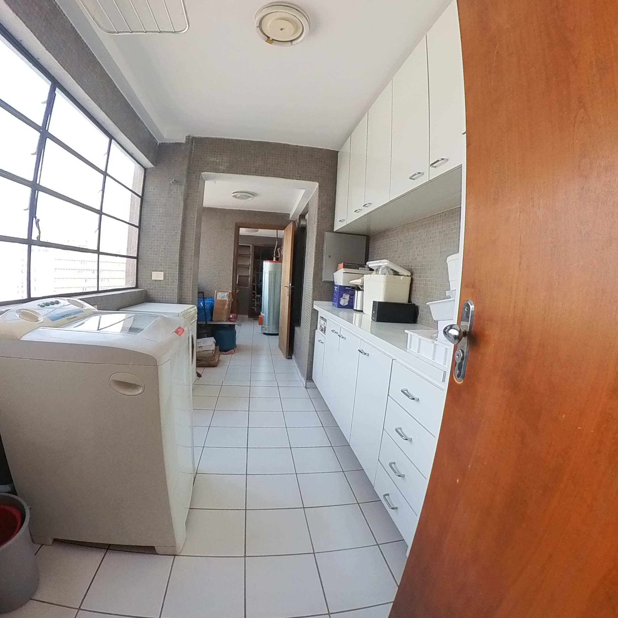 Na área de lavanderia tem-se a entrada de serviço independente e armários planejados. Também estão presentes itens da área técnica, como aquecedor de água e quadro de energia.