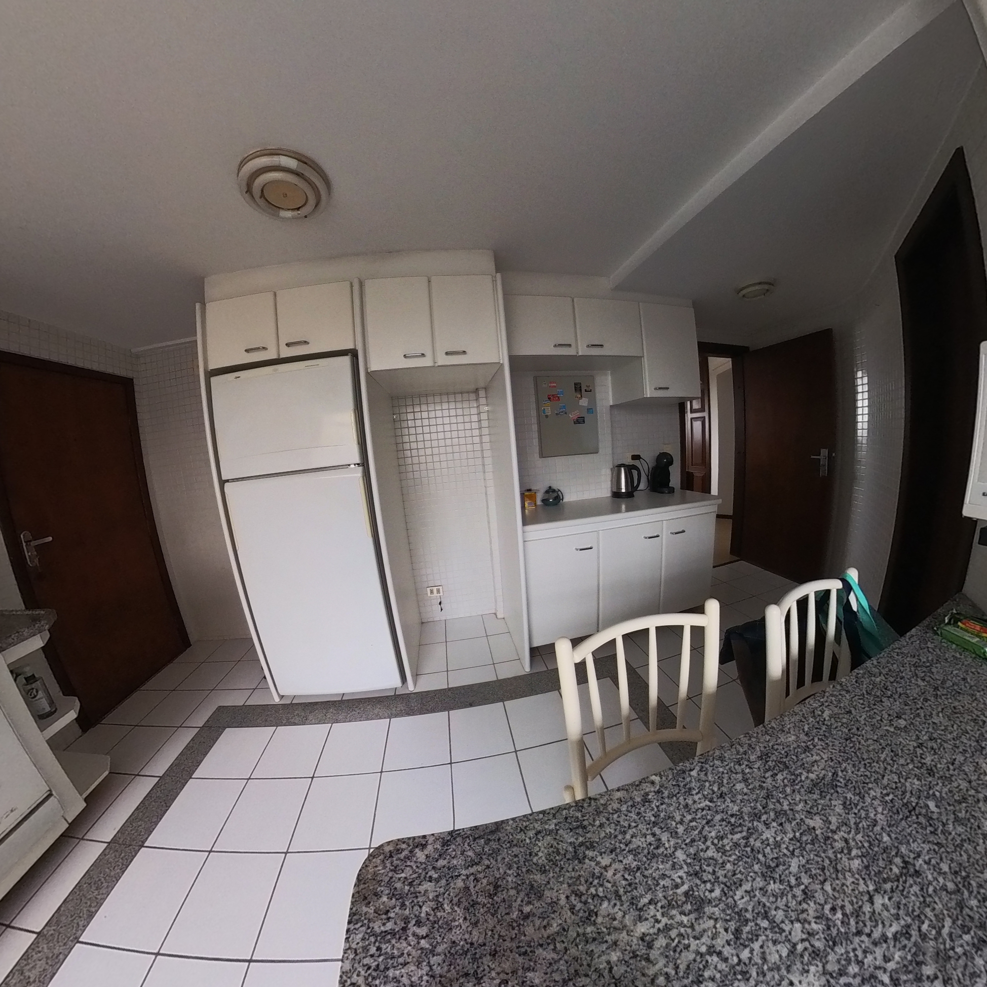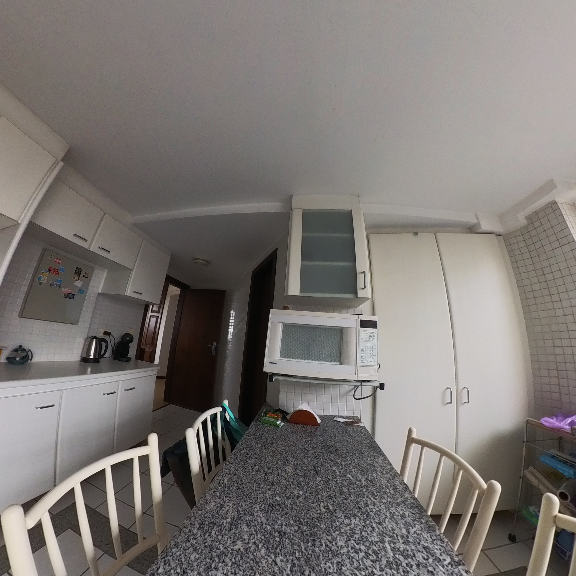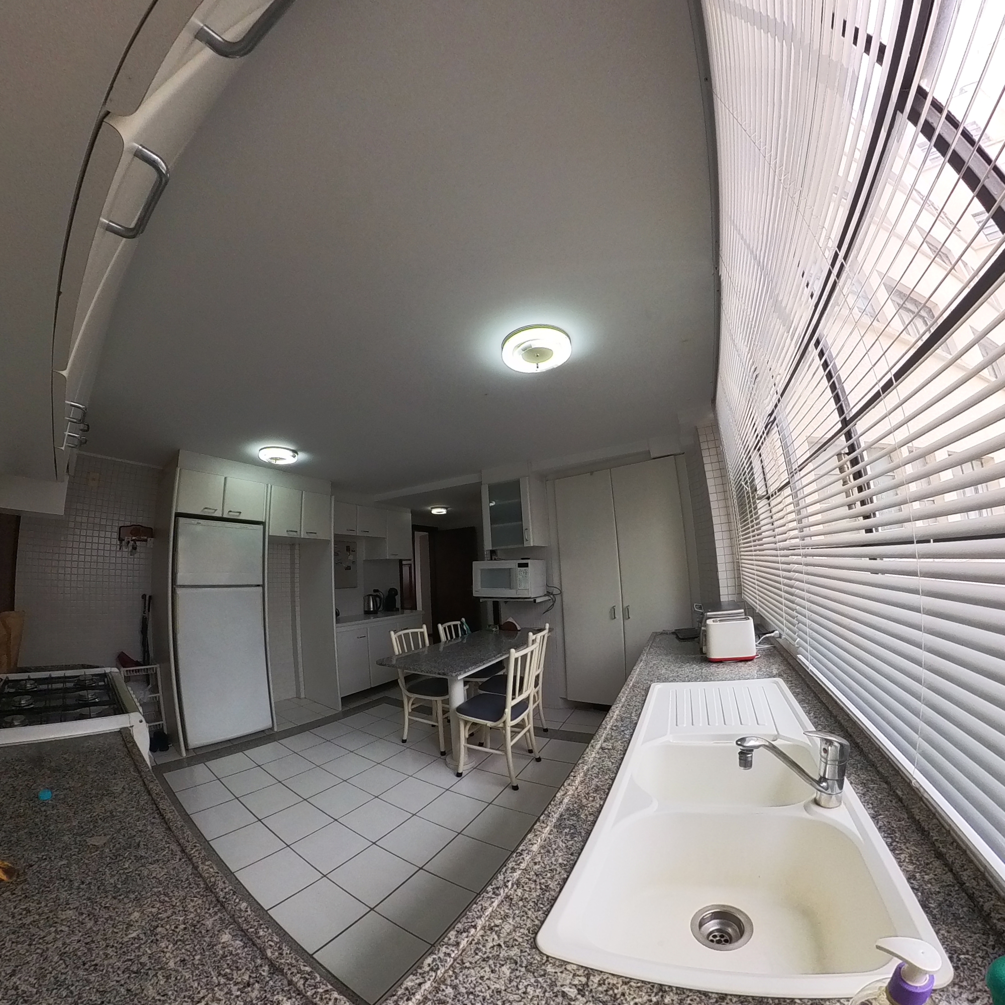 Adentrando pela porta social localiza-se uma ampla sala que integra 3 ambientes: área de refeição, sala de tv e sala de estar. A cozinha conta com grande variedade de armários com bancadas em granito, mesa em granito com 4 cadeiras, pia com cuba dupla, fogão com 6 bocas e forno, depurador, geladeira duplex e micro-ondas.