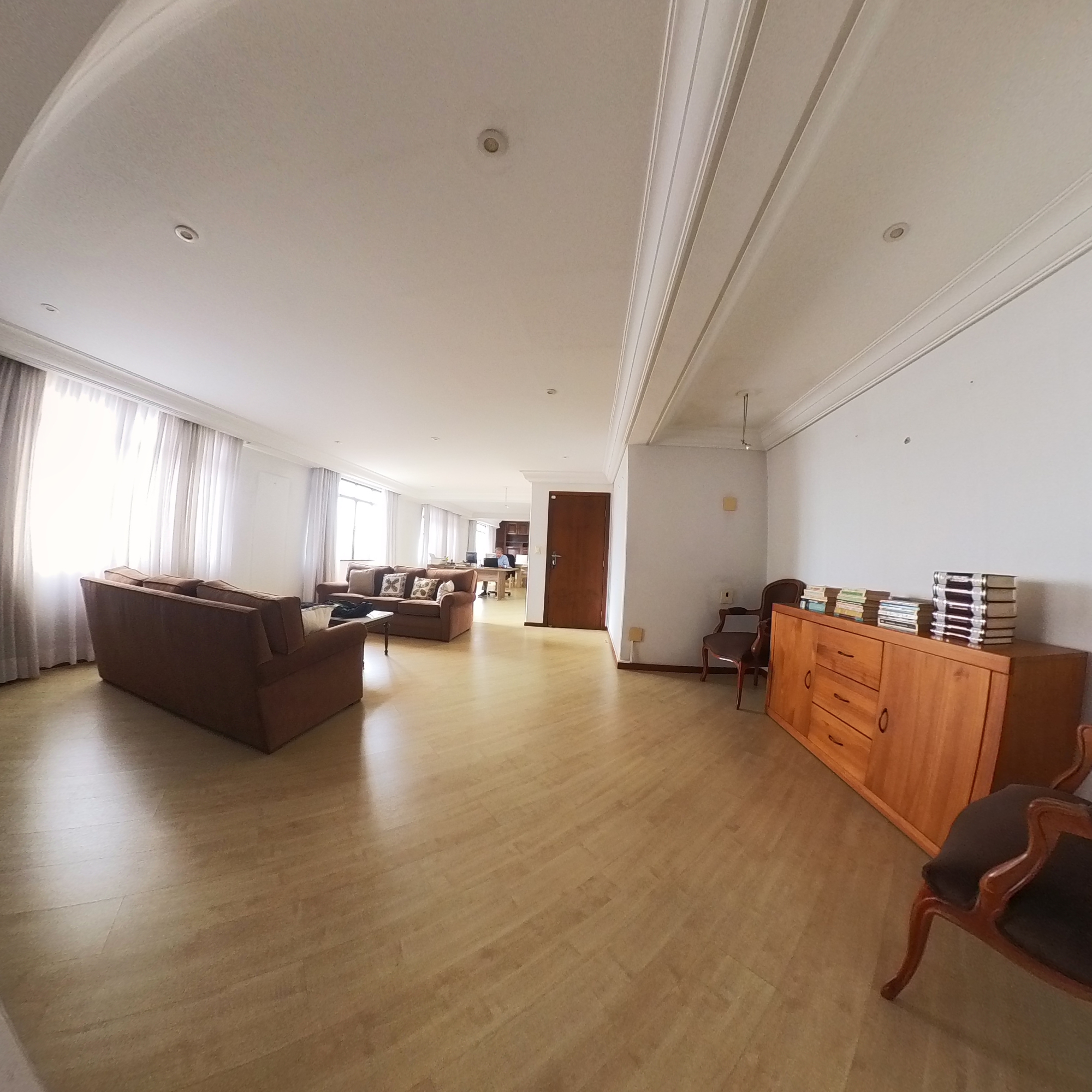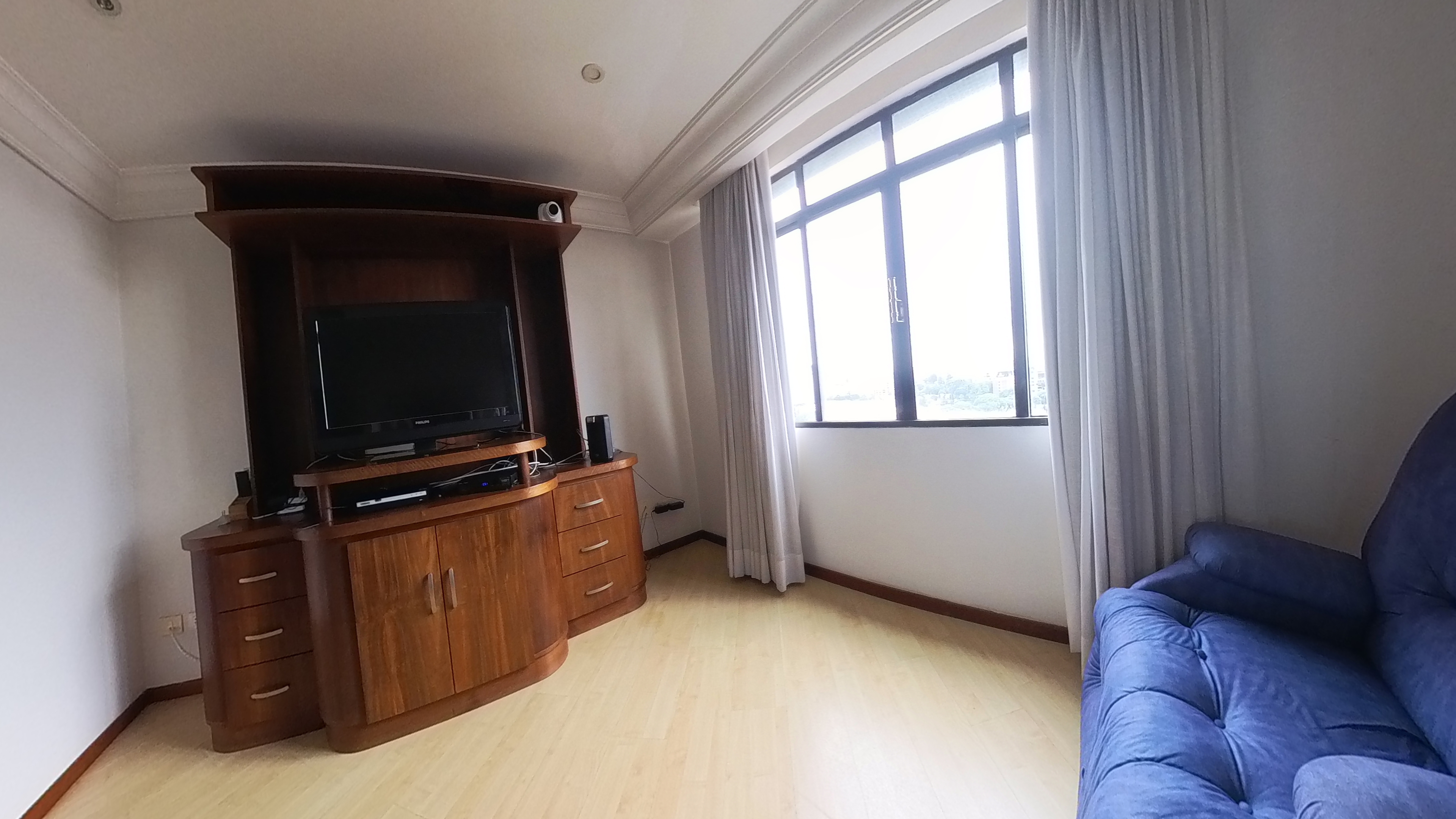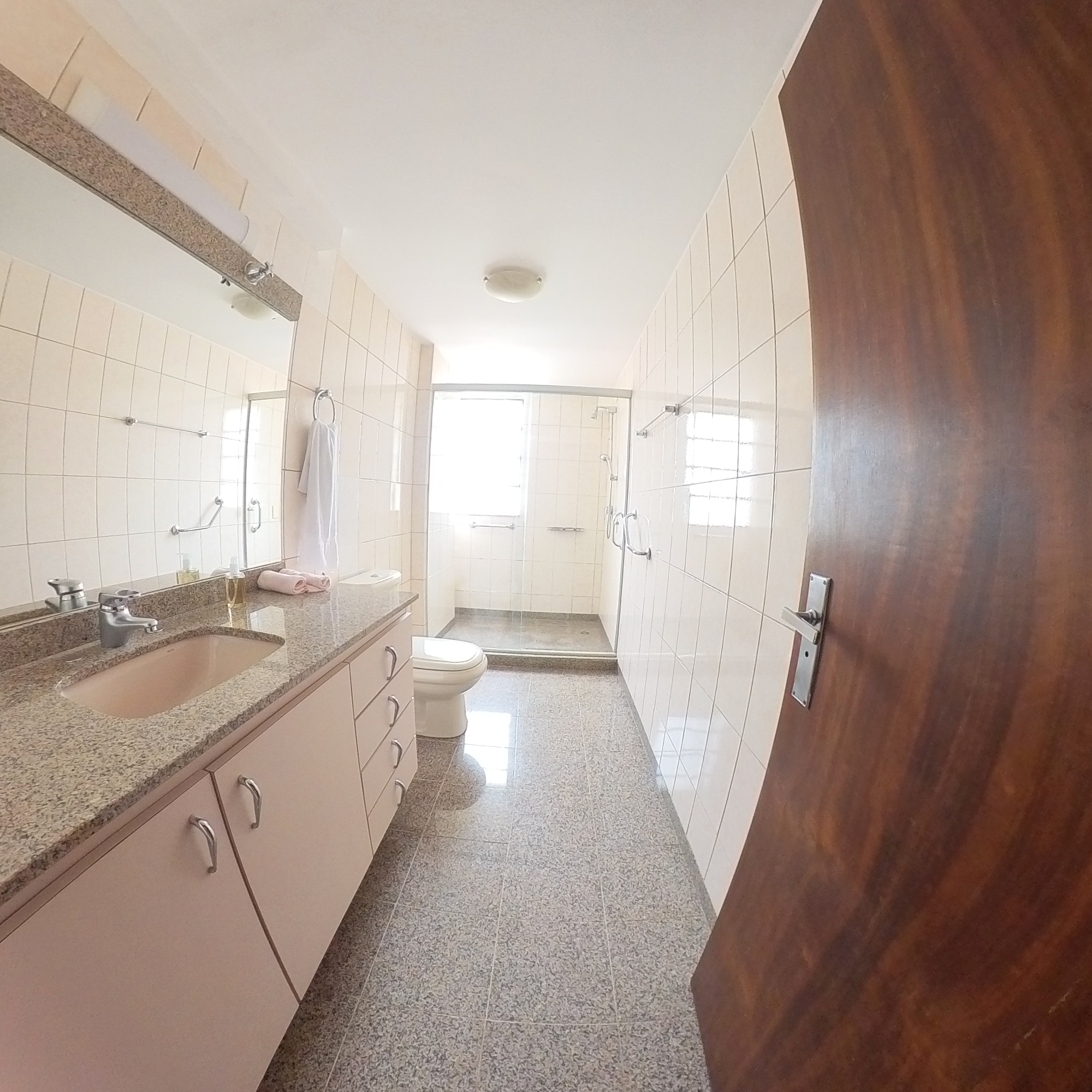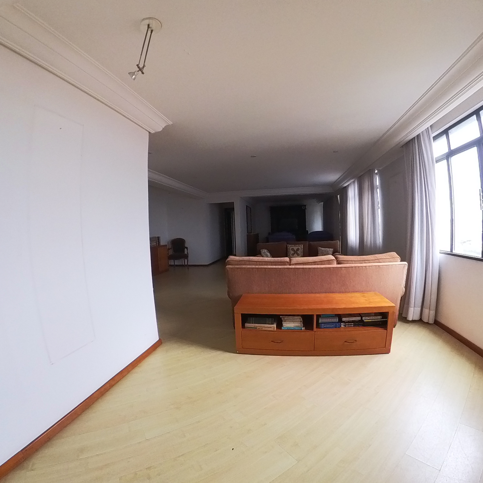 Sala integrada com 3 ambientes (sala de estar, sala de refeição e sala de TV), 1 suíte master, 1 suíte, 1 quarto, 3 banheiros, lavabo, cozinha com despensa, lavanderia externa ao apartamento, com dependência de empregada.
