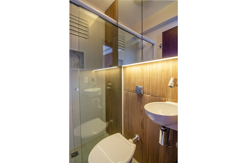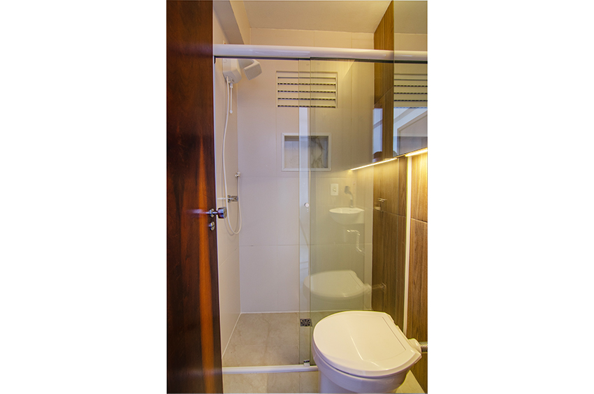 * Banheiro decorado com porcelanato padrão madeira, chuveiro elétrico de alta pressão 220V, box blindex e armário com espelho com iluminação em LED embutida.