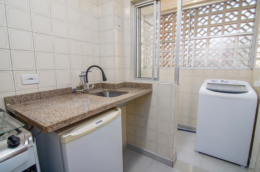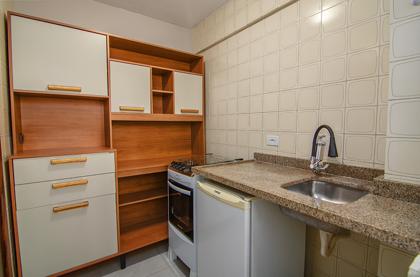 * Cozinha com balcão em granito, armário, fogão de 4 bocas e frigobar 120 litros.