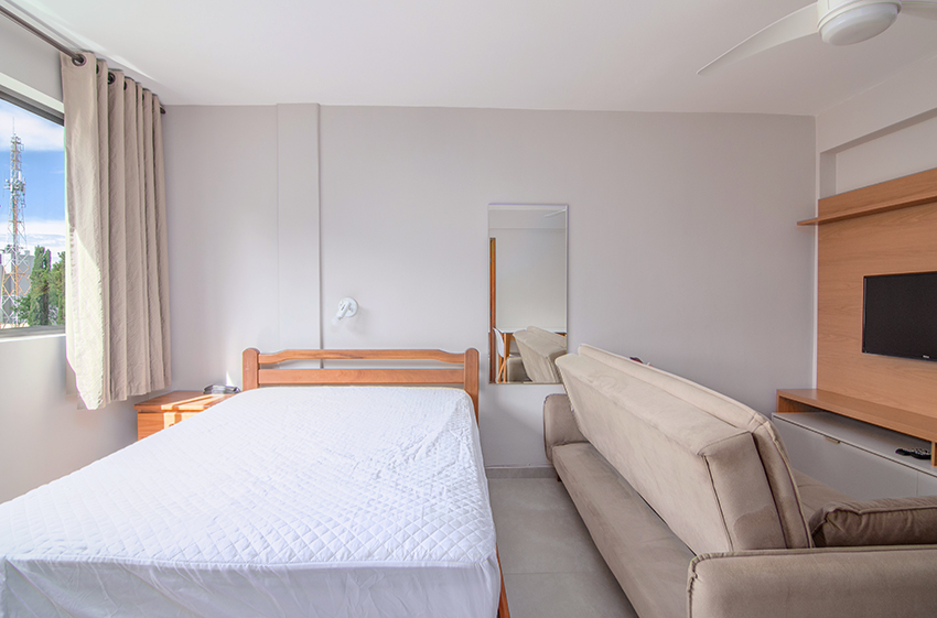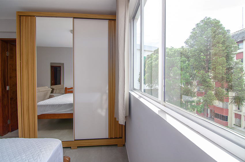 * Quarto com armário com portas de correr, cama box com colchão de molejo, criado mudo e cortinas blackout em tecido.