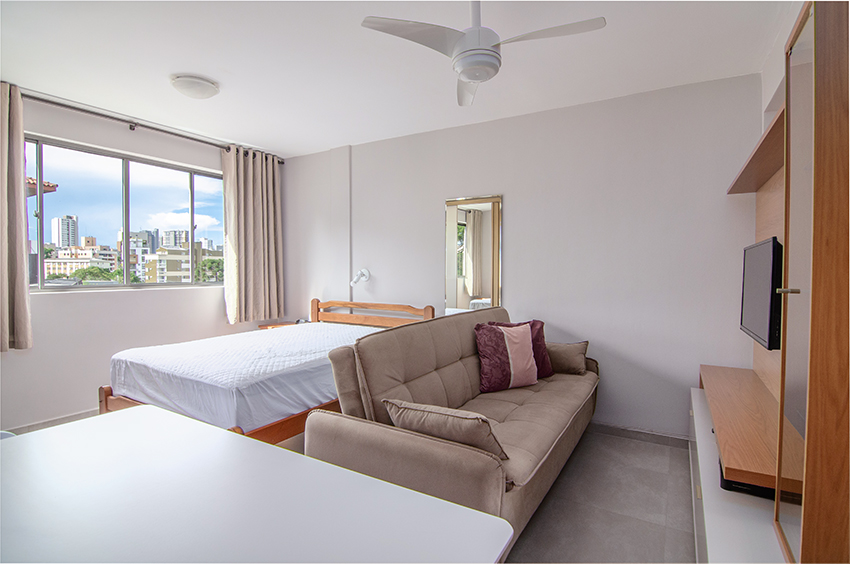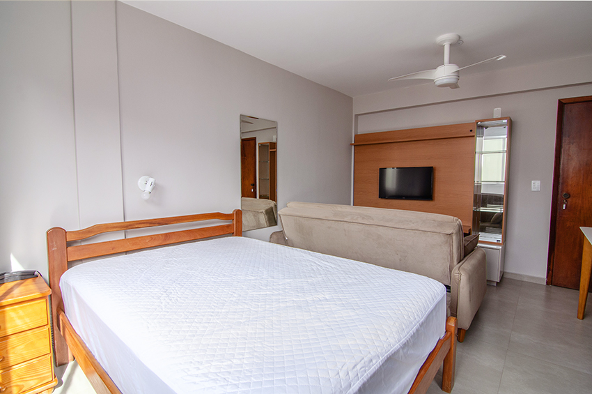 * Sala com sofá cama (casal) painel com TV de 43 polegadas com tv a cabo Claro (plano com 150 canais), ampla mesa para refeições com 2 cadeiras e ventilador de teto.