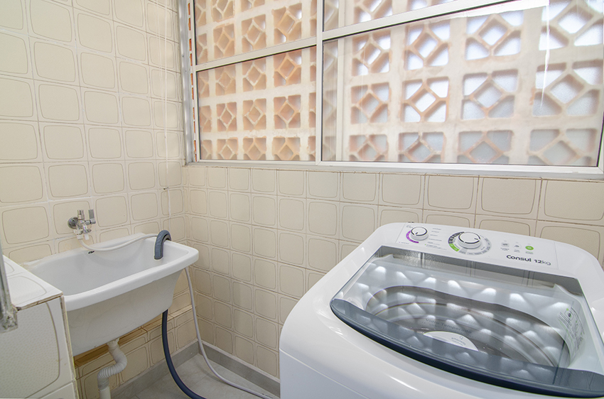 * Área de serviço bem ventilada com tanque em cerâmica e máquina de lavar roupa.